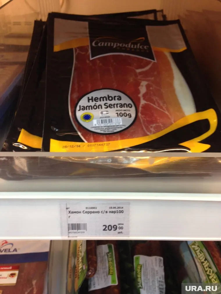 В Санкт-Петербурге, в супермаркете-«дворце» элитных продуктов «Елисеевский» на Невском проспекте, продают порядка десяти видов испанского и португальского хамона. Стоимость санкционных деликатесов рекордная — от 400 до 1000 рублей за сто грамм.