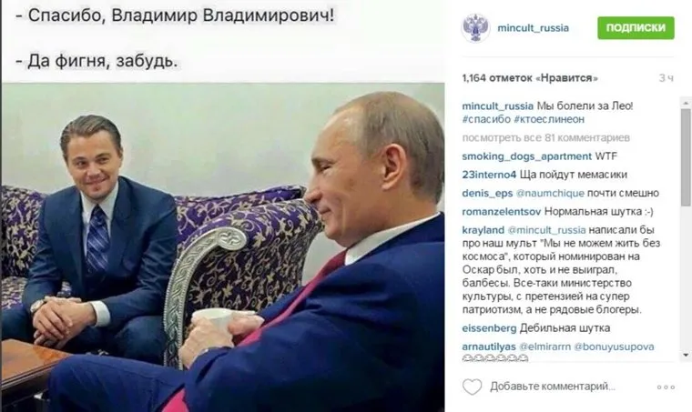 В Министерстве культуры РФ решили креативно поздравить голливудского актера Леонардо Ди Каприо с получением долгожданного «Оскара» . В Instagram (деятельность запрещена в РФ) сотрудники ведомства разместили коллаж, на котором изображены Ди Каприо и Владимир Путин. К снимку добавлен текст: «Спасибо, Владимир Владимирович! — Да фигня, забудь».