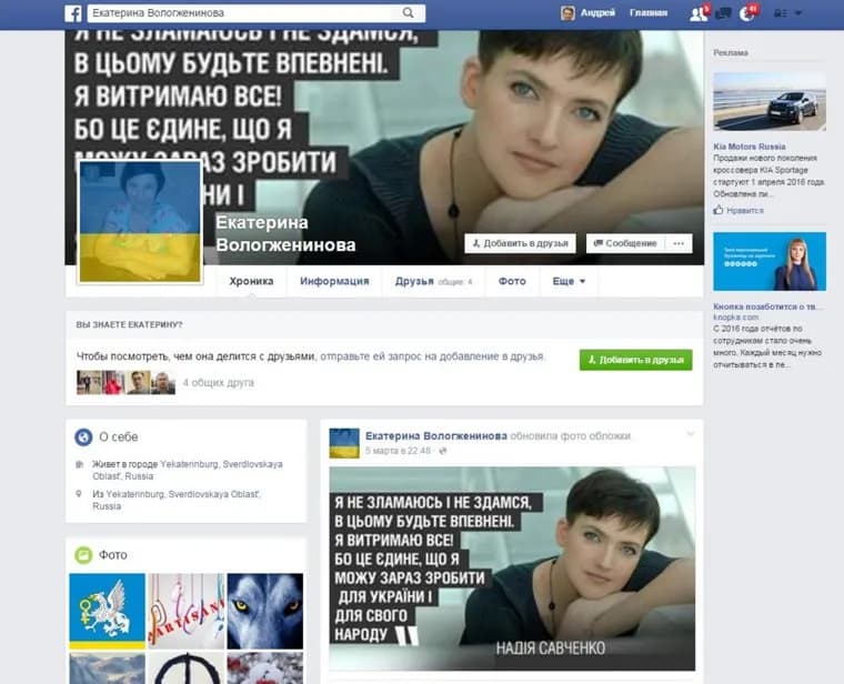 А 5 марта Екатерина разместила в своем аккаунте фото Надежды Савченко с начертанным на ней посланием от украинской летчицы «Я не зламаюсь I не здамся…» (я не сломаюсь и не сдамся). Эта же картинка вынесена на фото обложки страницы Вологжениновой. Под постом стоит четыре комментария, лайки и антилайки публикацию отметили 55 человек, четверо сделали перепосты.