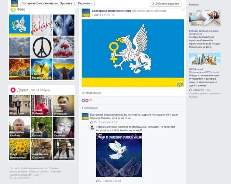 Правда, на этот раз она делает это не во «ВКонтакте» (в этой соцсети ее аккаунт почищен: все посты, которые могли бы вызвать вопросы у ФСБ, по словам адвоката, удалены), а в Facebook (деятельность запрещена в РФ). Первая запись на страничке в FB (деятельность запрещена в РФ) — карикатура с крысой и куском сыра, посвященная санкциям — появилась еще 13 августа. Самым ярким по цветовой окраске стало поздравление «З Днем незалежностi» (24 августа) и смена профиля 16 ноября — Вологженинова раскрасила свое фото в желто-голубые цвета украинского флага.