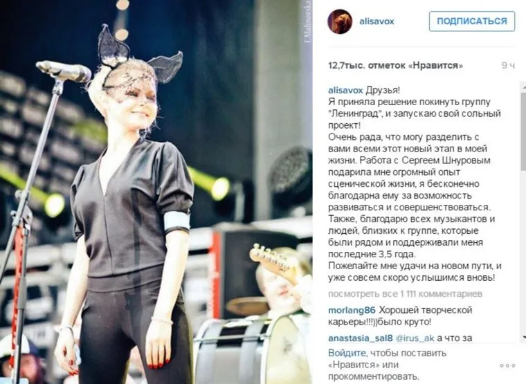 «Друзья! Я приняла решение покинуть группу „Ленинград“ и запускаю свой сольный проект! Очень рада, что могу разделить с вами всеми этот новый этап в моей жизни. Работа с Сергеем Шнуровым подарила мне огромный опыт сценической жизни, я бесконечно благодарна ему за возможность развиваться и совершенствоваться», — рассказала своим подписчикам Алиса. Ее пост на момент публикации материала набрал уже 12,5 тысяч «лайков».