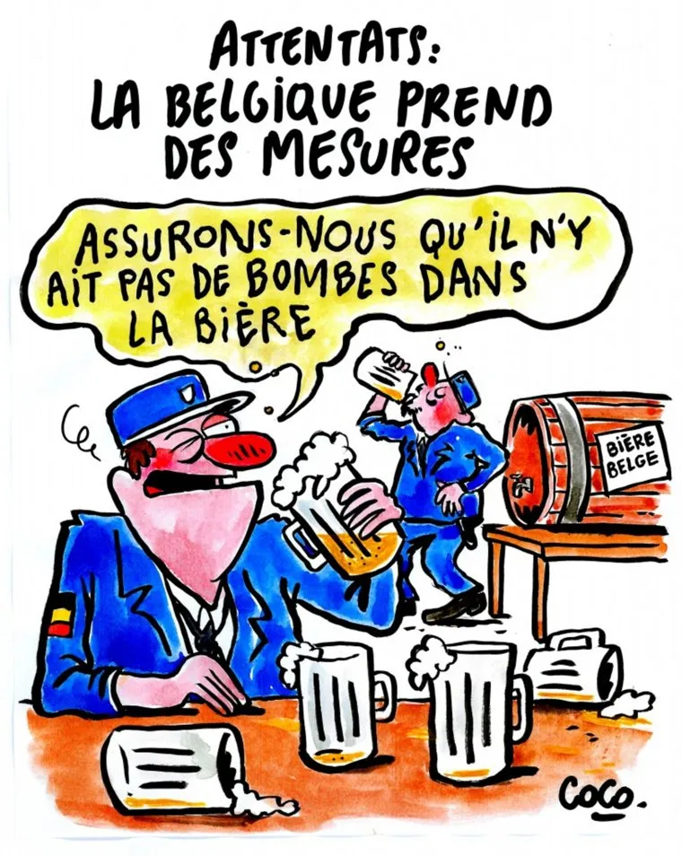 «Убедись, что в кружке нет бомбы», — говорит один полицейский другому. Они проводят серьезную проверку бельгийского пива.