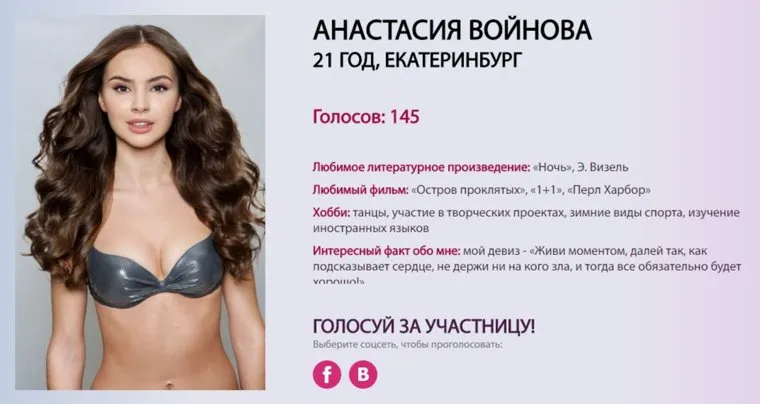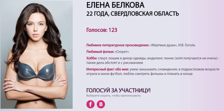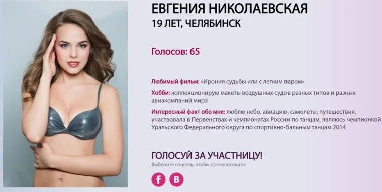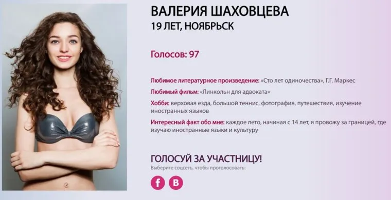 У каждой девушки есть «карточка» с фотографией в сером купальнике, а также с информацией о конкурсантке. Финалистки рассказали, какую книгу и кино считают любимыми, чем увлекаются, и сообщили интересный факт о себе. Например, 18-летняя тюменка Яна выступала на открытии Олимпиады в Сочи.