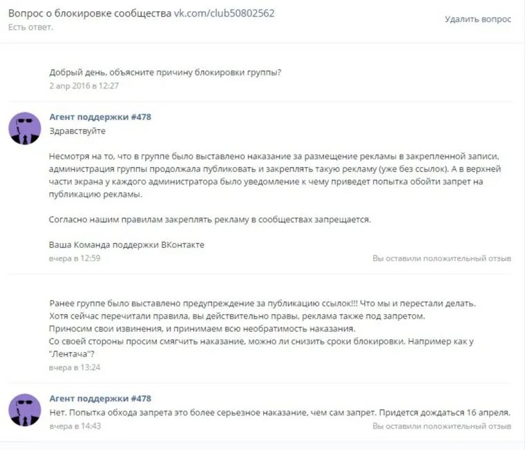 «Несмотря на то, что группе было внесено наказание за размещение рекламы в прикрепленной записи, администрация сообщества продолжала публиковать и закреплять такую рекламу (уже без ссылок). В верхней части экрана у каждого администратора было уведомление, к чему приведет попытка обойти запрет на публикацию рекламы. Согласно нашим правилам, закреплять рекламу в сообществах запрещается», — говорится в сообщении службы поддержки соцсети.