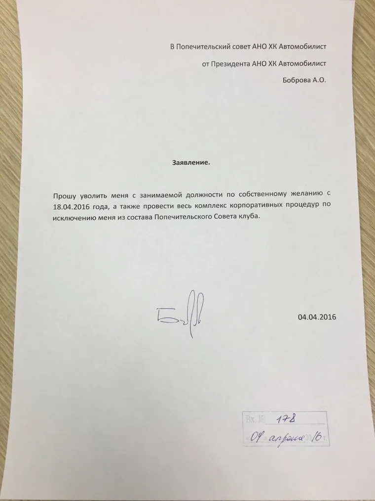 Срочно! Алексей Бобров оставляет пост президента хоккейного клуба «Автомобилист». СКАН заявления