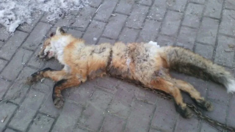 На площади Нефтяников возле школы №3 в Сургуте нашли мертвую лису. Над животным издевались дети.