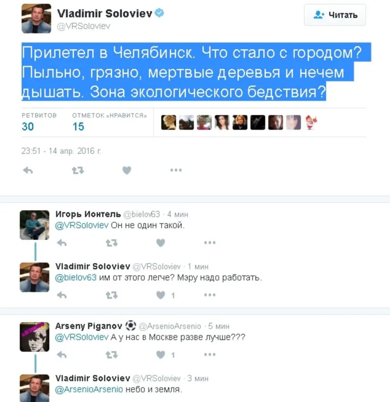 «Прилетел в Челябинск. Что стало с городом? Пыльно, грязно, мертвые деревья, и нечем дышать. Зона экологического бедствия?» — так описал свои впечатления Соловьев. Заметим, что с творческими встречами он приезжает южноуральскую столицу регулярно и в принципе способен оценить происходящие с городом изменения в динамике.