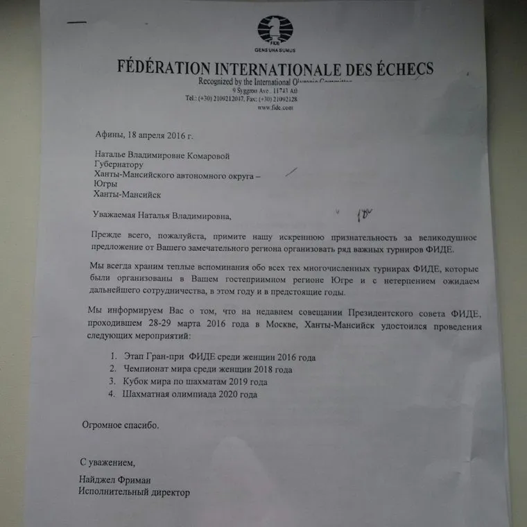 «Мы информируем вас о том, что на недавнем совещании президентского совета ФИДЕ, проходившем 28—29 марта 2016 года в Москве, Ханты-Мансийск удостоился проведения следующих мероприятий: 1. Этап Гран-при ФИДЕ среди женщин 2016 года. 2. Чемпионат мира среди женщин 2018 года. 3. Кубок мира по шахматам 2019 года. 4. Шахматная олимпиада 2020 года. Огромное спасибо», — сказано в письме за подписью исполнительного директора ФИДЕ Найджела Фримана.