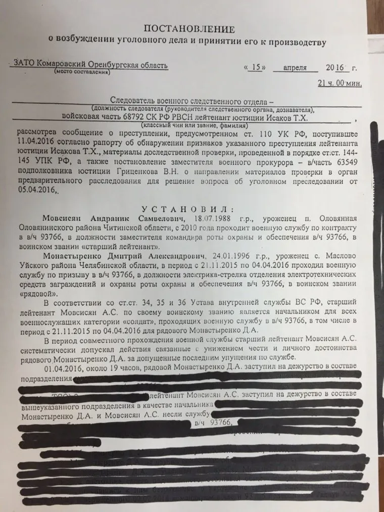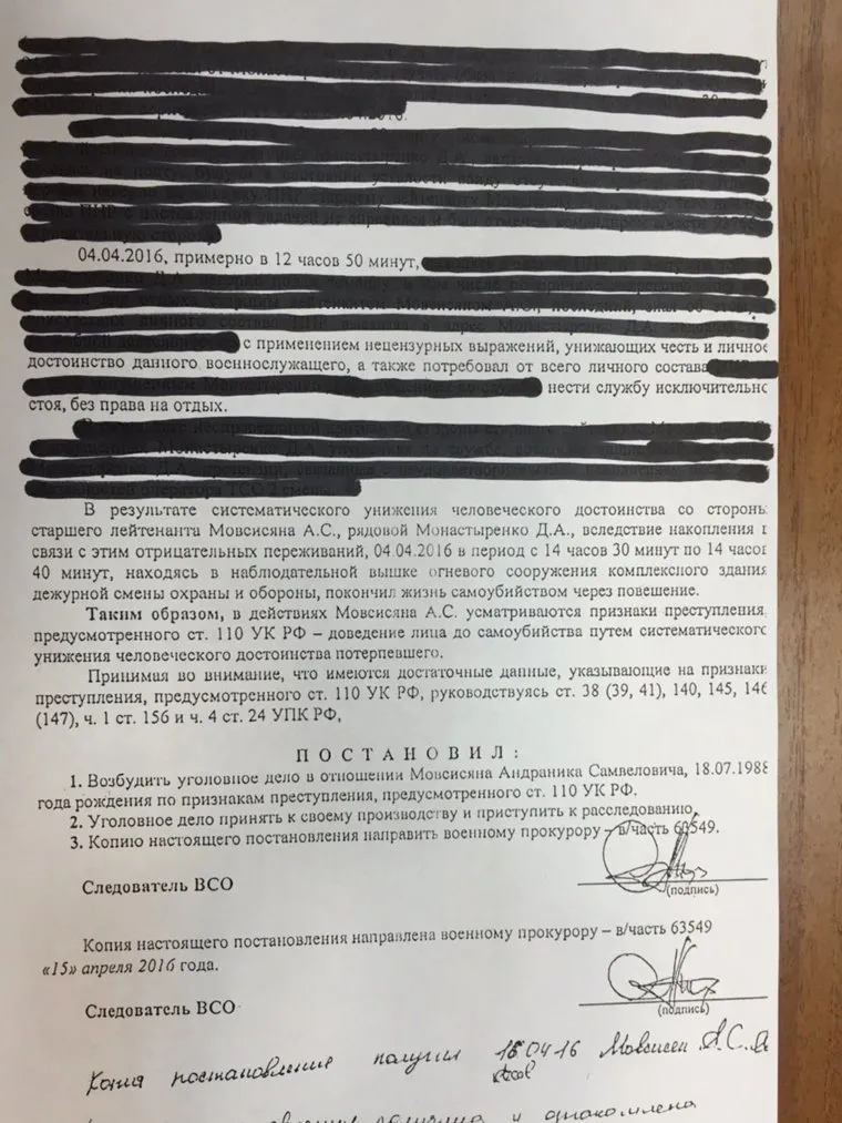 «Превысив должностные полномочия, включающие применение нецензурных выражений, унижающих честь и личное достоинство, требовал исполнения не предусмотренных уставом своих желаний, нести службу исключительно стоя, без права на отдых, тем самым довел до самоубийства подчиненного рядового Монастыренко Дмитрия», — говорится в постановлении о возбуждении уголовного дела. Значительная часть подробностей происходящего при этом попросту вымарана из текста и остается лишь догадываться, что происходило в тот день за забором засекреченного подразделения.