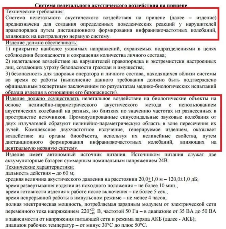 Предел переносимости звукового воздействия наблюдается при 154 дБ. При 180—190 дБ действие инфразвука смертельно вследствие разрыва легочных альвеол. Закупаемый МВД аппарат должен выдавать до 120 дБ на расстоянии до 20 метров от рефлектора и работать в импульсном режиме не менее 4 часов. Дальность действия инфразвука — до 60 метров. Оборудование, очевидно, достанется созданной в апреле Росгвардии.