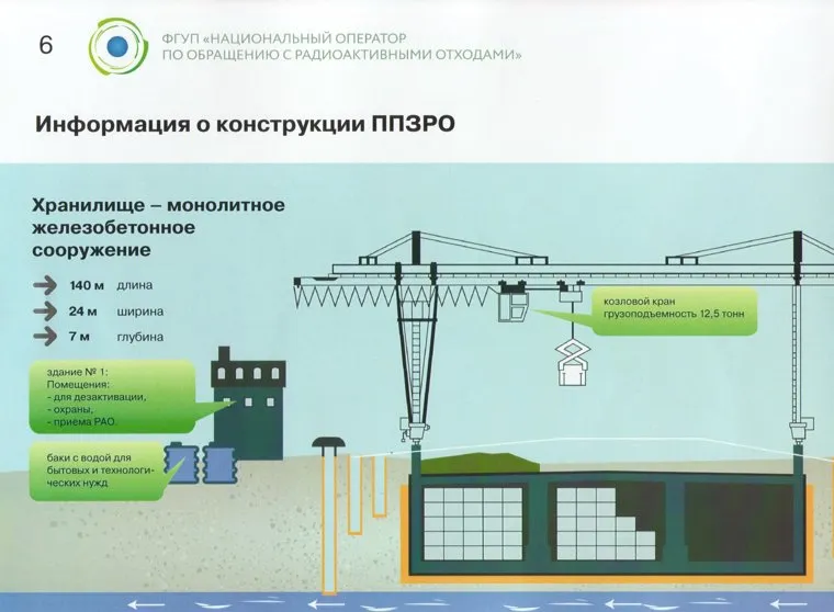 Корреспонденты «URA.Ru» заранее побывали на этом секретном объекте. «Наше хранилище — это железобетонная конструкция длиной 140 метров, 24 метра шириной и 7 метров в глубину, — рассказал «URA.Ru» руководитель филиала «Северский» ФГУП «Национальный оператор по обращению с радиоактивными отходами» Вячеслав Александров. — Емкость первой очереди — 10 тыс. м³, второй и третьей в сумме — также 10 тысяч кубов. Проектная мощность объекта — 1000 м3/год».