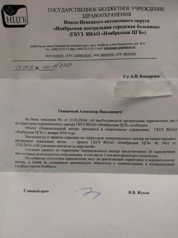 В ответ на письмо активного гражданина главный врач Ноябрьской ЦГБ Игорь Жуков сообщил, что есть 36 парковочных мест, но они — для персонала (в том числе, 3 для инвалидов). Вопрос о местах для стоянки посетителей и пациентов г-н Жуков предложил задать мэрии.