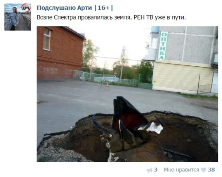 Провал моментально стал поводом для фотожаб. «Дрожь земли 7: Гробоиды в Арти», — шутят подписчики, публикуя в пабликах уже отредактированные в фотошопе картинки: из огромной ямы торчит червь из вышеупомянутого фильма.