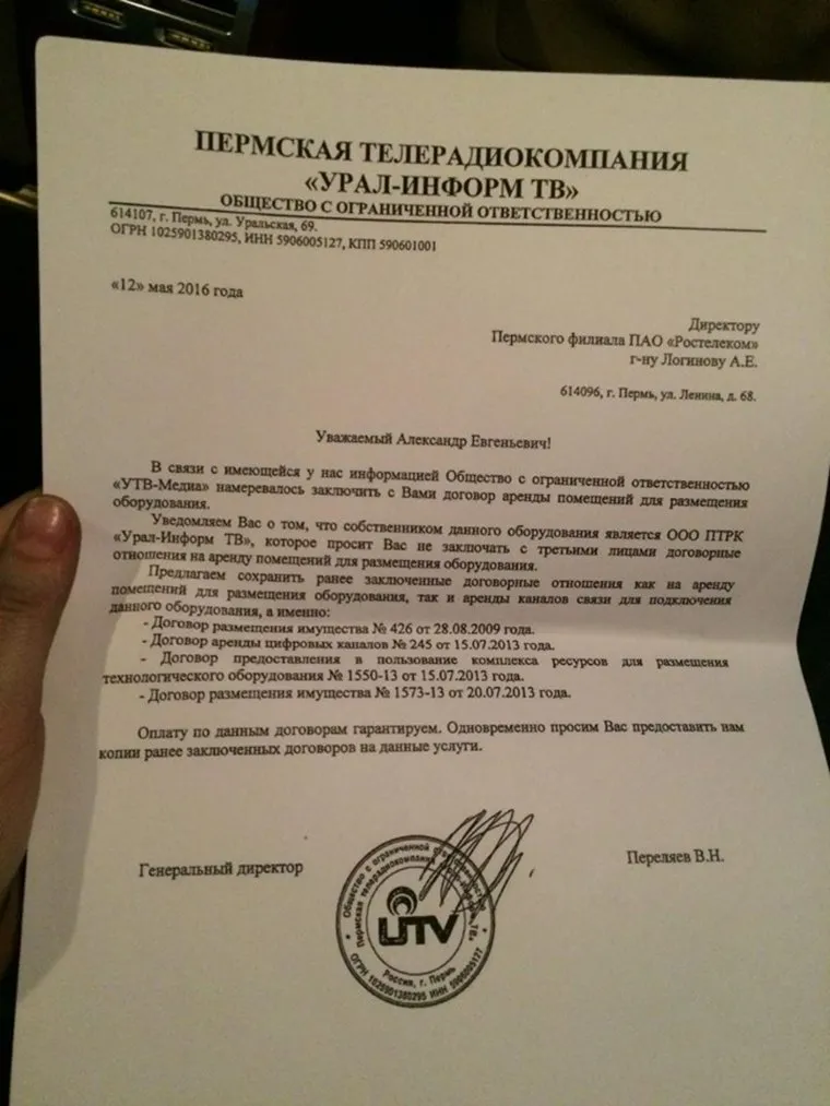 Как пояснили «URA.Ru» в пермском филиале «Ростелекома», оператор связи действительно получил письмо от ООО «Пермская телерадиокомпания «Урал-Информ ТВ», подписанное генеральным директором В.Н. Переляевым. В письме содержалась просьба о допуске специалистов «УИТВ» к оборудованию, расположенному на площадях оператора связи. «Оператор связи не находит оснований в отказе или в ограничении доступа законным представителям телекомпании к оборудованию этой организации. Подчеркиваем, что оператор связи действовал и намеревается действовать впредь в строгом соответствии с действующим законодательством. Рассчитываем на оперативную реакцию правоохранительных и надзорных органов на ситуацию», — пояснили в «Ростелекоме».