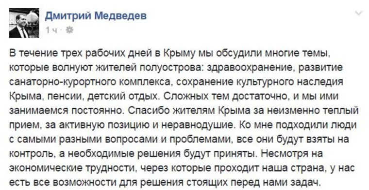 Премьер-министр РФ Дмитрий Медведев пообещал взять под контроль проблемы, названные крымчанами в ходе визита главы кабмина на полуостров. Об этом Медведев написал в Facebook (деятельность запрещена в РФ).