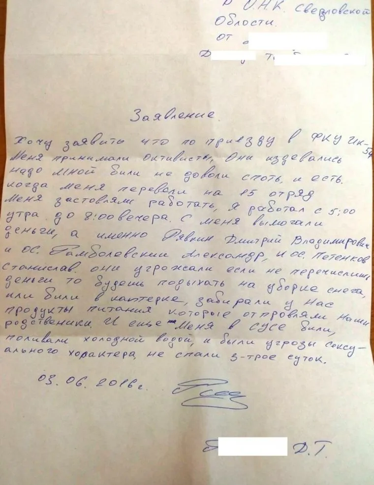 Заявление одного из осужденных ИК-54