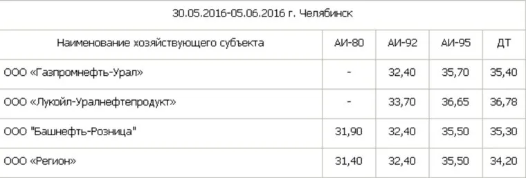 С 30 мая по 5 июня произошло повышение розничных цен на бензин у ООО «Газпромнефть-Урал» и ООО «Регион». Так, на заправках «Газпромнефти» на 10 копеек подорожали и «девяносто второй», и «девяносто пятый». «Регион» повысил розничные цены на все виды бензинов: АИ-80 подорожал на 20 копеек, АИ-92 — на 40 копеек, АИ-95 — на 80 копеек.