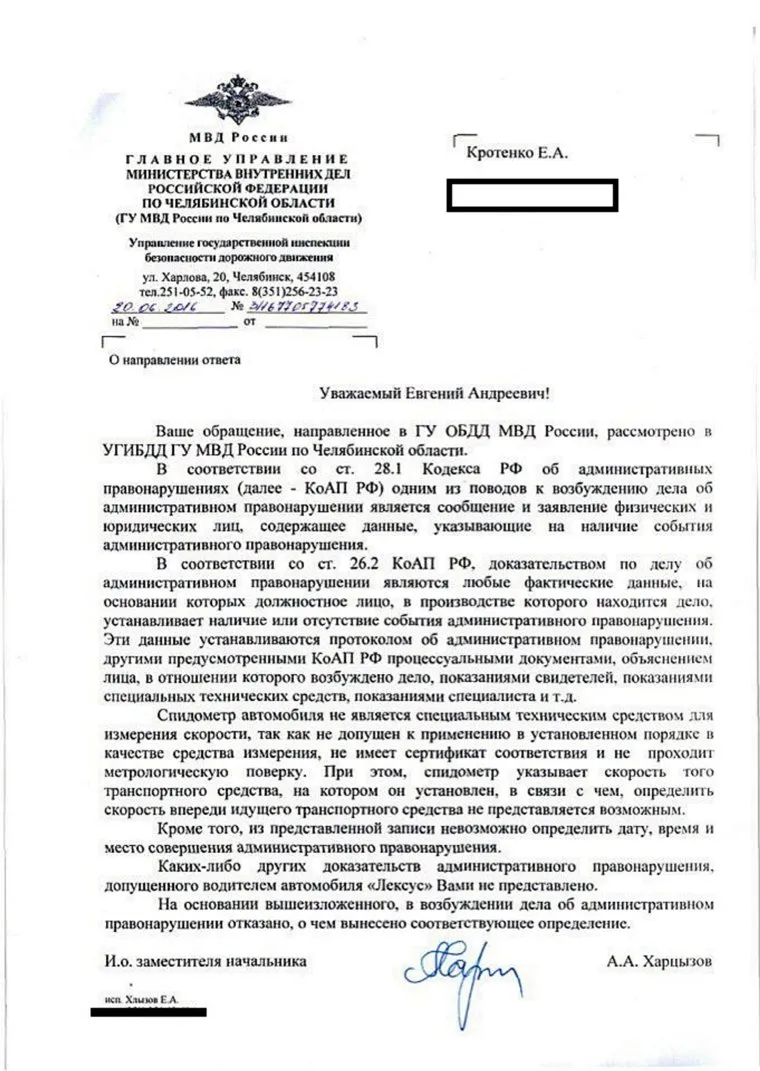 Собственно, этого было бы уже достаточно. Но на всякий случай полицейские оговаривают, что по представленной записи видеорегистратора невозможно определить дату, время и место совершения административного правонарушения. «Каких-либо других доказательств административного правонарушения, допущенного водителем автомобиля „Лексус“, Вами не представлено», — заключает Харцызов.