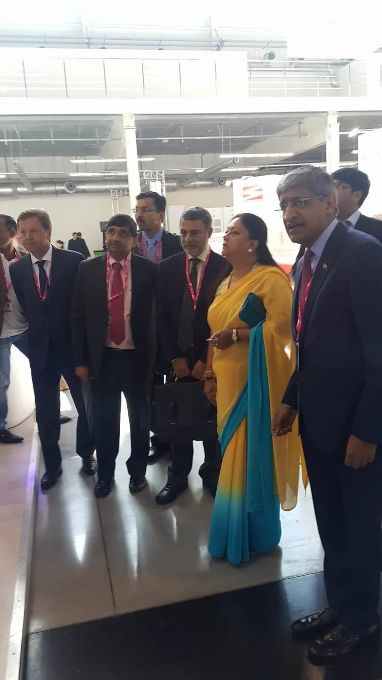 09:42 Губернатор Евгений Куйвашев и министр Денис Мантуров в павильоне! Звучит объявление обхода на английском языке, все смотрят на стенд с надписью Make in India.