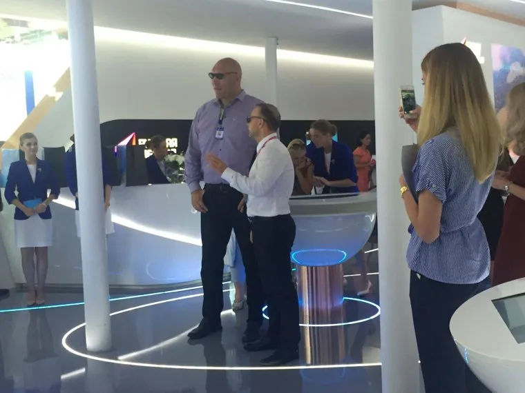 12:53 Неизвестный мужчина в возрасте за 45 интересуется у модели в форме «Уральских авиалиний»: «А что вы делаете? Я не понимаю по стенду». Та поясняет направленность работы компании, чей стенд напоминает трубу с лесенкой, и намекает на сферу авиасообщения маленькой моделькой самолета на информационной стойке.