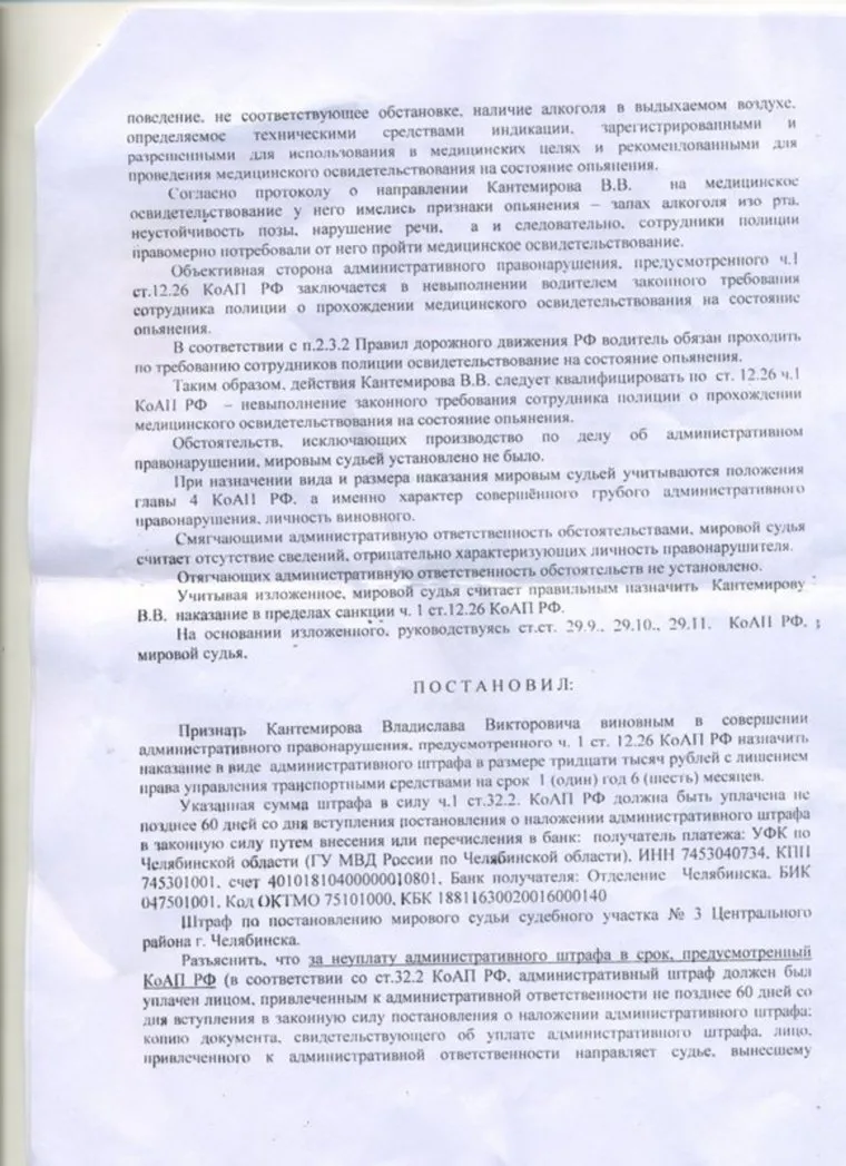 Мировой суд Центрального района лишил водительских прав и оштрафовал на 30 тыс. рублей челябинского рабочего Владислава Кантемирова. Он известен многим, как человек, разбивший «Роллс-Ройс» олигарха Александра Аристова. Основанием стал отказ от прохождения медосвидетельствования на состояние опьянения, сообщает «URA.Ru».