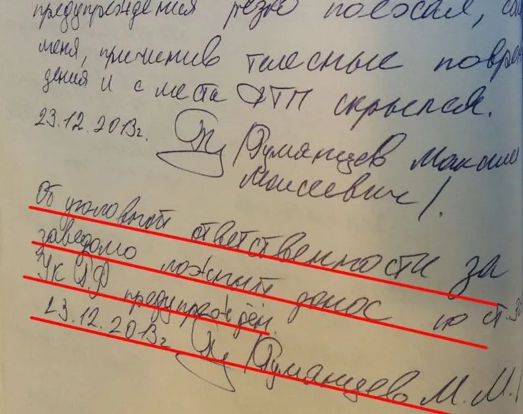 Морозов уточняет, что за наезд ГИБДД лишила его прав на 14 месяцев. Румянцев попытался возбудить уголовное дело, обвинив мэра в нанесении телесных повреждений. Однако, в заявлении СКР он указал на травму левого колена, которое даже не могло быть задето, если бы декабрьский инцидент 2013 года и имел место. Как позже выяснили судебные эксперты, мениск левого колена был поврежден еще несколько лет назад во время автомобильной аварии, в которую попадал журналист. По версии Морозова, давнюю травму его оппонент пытался представить за последствия наезда «Порше». «Румянцев, пытаясь возбудить уголовное дело, давал подписку об ответственности за дачу заведомо ложных показаний. Эксперты доказали, что повреждений нанесено не было, как не было и ДТП», — резюмировал мэр Атига. По его мнению, Румянцев сознательно вводил СКР в заблуждение, за что имеется статья в УК РФ, предусматривающая ответственность за ложный донос.