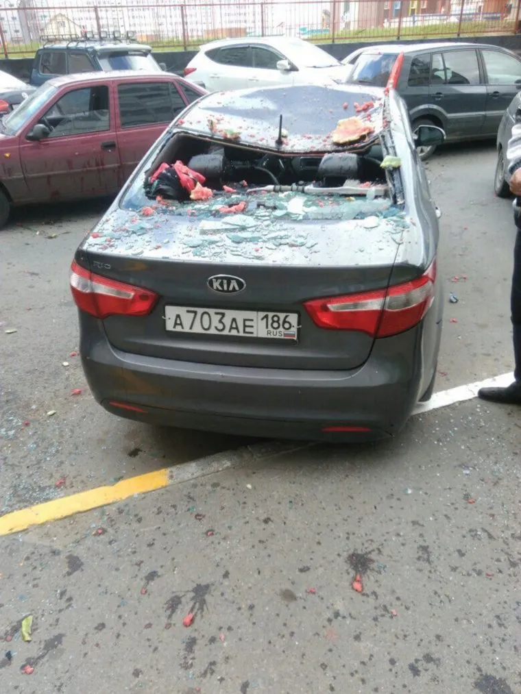 Как уже сообщало «URA.Ru», инцидент произошел утром 31 июля во дворе дома №41 по улице Университетской в Сургуте. Арбуз упал прямо на крышу припаркованной у первого подъезда автомобиля. Удар был такой силы, что у иномарки выбило заднее стекло и помялась крыша.
