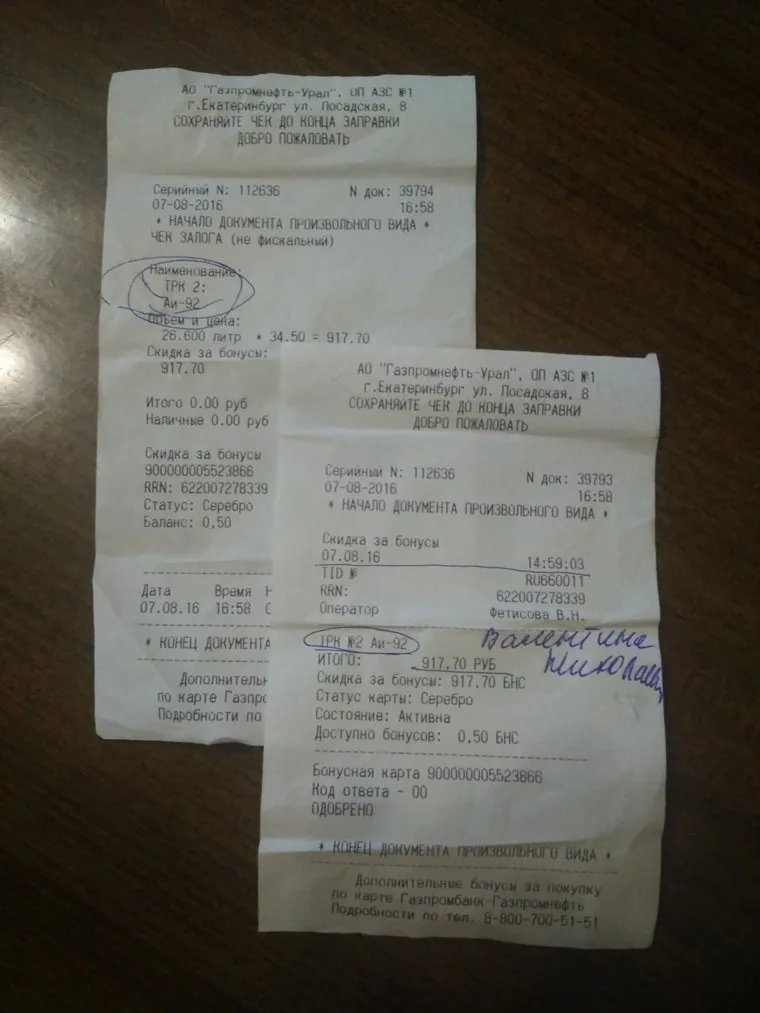 Далее, по ее словам, начинается и совсем странное. «Производится оплата, выдаются карта и чек. Но, оказывается в этот момент включается вторая колонка и заливается 92 бензин на сумму 917 рублей, т. е. 26,6 литра в чужую машину! Затем молодой человек подает сто рублей, включается уже моя третья колонка. Мне заливается 2,26 л 95 бензина. Вторая машина резко уезжает с АЗС. Только тогда я обратила внимание, что в чеке пробито: 2 колонка 92 бензин 26,6 л на сумму 917 руб. 70к. В результате на 917 руб. было залито в мою машину всего два литра 95 бензина», — рассказывает Анастасия. Таким образом, литр бензина обошелся девушке в 406,6 рубля.
