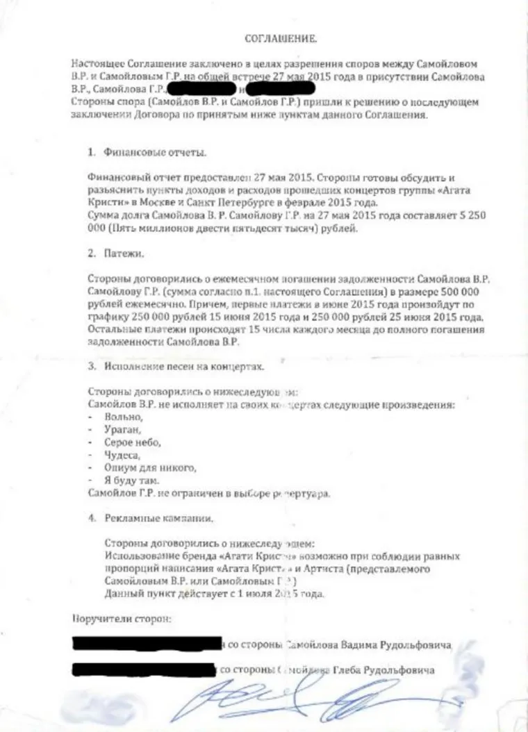 Предметом спора между братьями стал репертуар «Агаты Кристи» — песни, которые братья записали вместе. Глеб Самойлов, судя по присланному в редакцию соглашению, требует от Вадима не исполнять ранее записанные треки, так как именно у него единственные авторские права на песни.