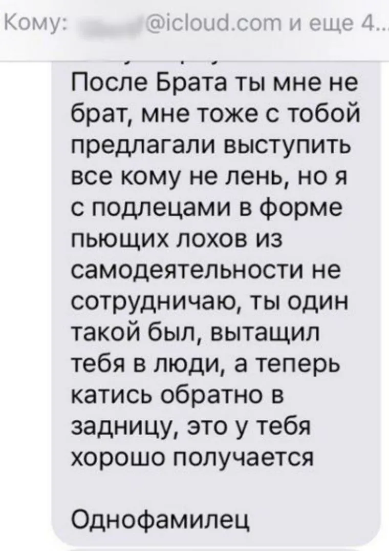 Вадим Самойлов не стесняется в выражениях по отношению к младшему брату, называя Глеба «Иудой», «подопечным» или «однофамильцем». Личная переписка братьев, по сообщению источника, предоставившего информацию нашему агентству, была опубликована в общем чате участников группы «Агаты Кристи».
