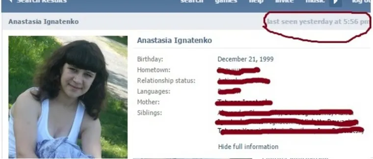 Скриншот страницы Анастасии Игнатенко, демонстрирующий, что кто-то выходил в он-лайн с ее страницы в день, когда она уже считалась пропавшей