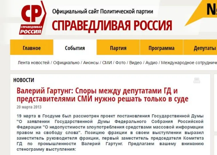 Отметим, что в 2013 году на заседании в Госдуме РФ, когда рассматривался проект постановления «О заявлении Государственной Думы Федерального Собрания Российской Федерации „О недопустимости злоупотребления средствами массовой информации правом на свободу слова“» Валерий Гартунг призвал депутатов решать споры со СМИ только через суд. В период выборов руководитель регионального отделения «Справедливой России» о своих предложениях забыл.