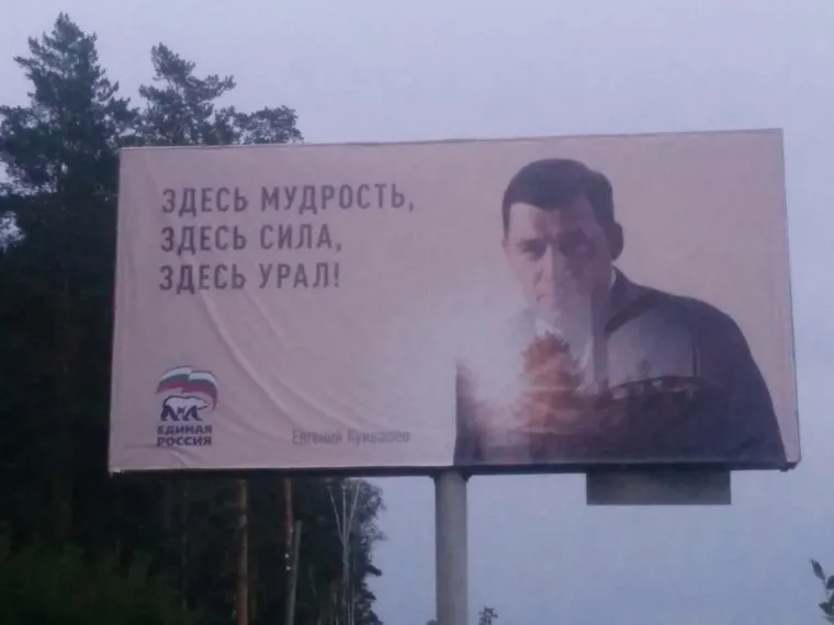 Справа на плакате напечатан силуэт чиновника, в котором помещен пейзаж города. Слева написаны слова «Здесь мудрость, здесь сила, здесь Урал!». Внизу подпись «Евгений Куйвашев» и логотип правящей партии.