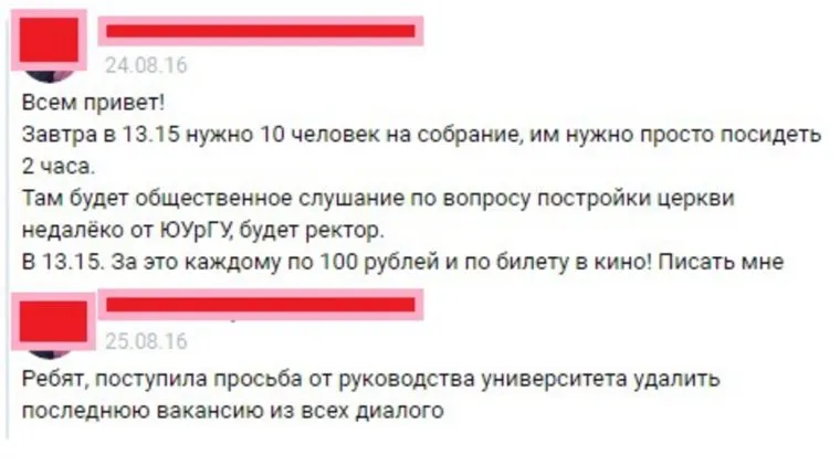 Студентка на своей странице «ВКонтакте» выложила скрин переписки с коллегами-трудоргами от разных факультетов. 24 августа они ищут массовку для слушаний. А 25 августа, в день мероприятия, просят удалить сообщение об этой вакансии из личных диалогов по «просьбе от руководства». «Говорите, студенты приняли решение?.. Так что мы готовим жалобу в городскую администрацию. После всего этого решение слушаний должно быть признано недействительным», — заключает активистка.