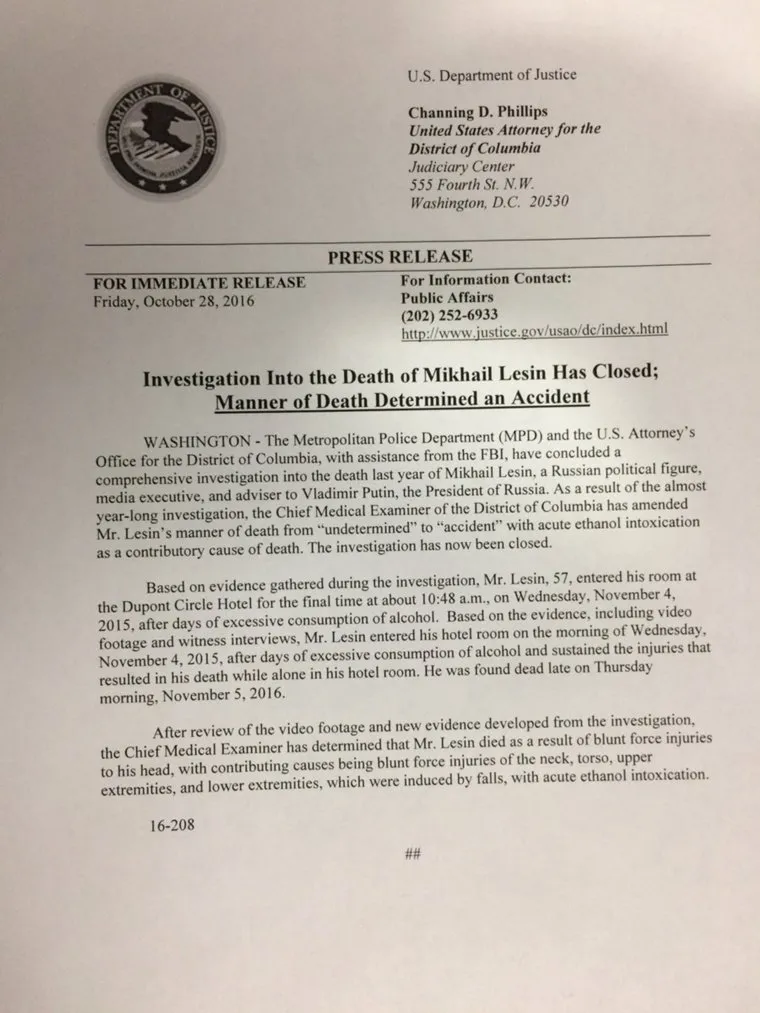 В документе говорится, что незадолго до смерти погибший употреблял алкоголь. Лесин зашел в свой номер в отеле Dupont Circle не позже 10.48 утра 4 ноября, к тому времени он в течение нескольких дней употреблял спиртное — об этом говорит видео с камер наблюдения, а также показания свидетелей. Затем экс-министр получил ранения, от которых скончался, когда был один в номере отеля. Указывается, что несчастному случаю способствовала «острая интоксикация этанолом».