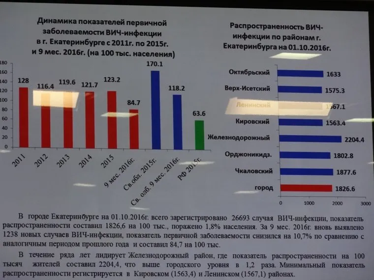 «У нас показатель зараженности — 1826 человек на 100 тысяч, это 1,8% населения города, ВИЧ-инфекцией заражен каждый 50-й житель Екатеринбурга», — рассказала Савинова. По ее данным, в Екатеринбурге зарегистрировано 26693 случая ВИЧ-инфекции, но, как отметила замначальника городского управления здравоохранения, это лишь те случаи, которые официально известны — реальная заболеваемость выше.