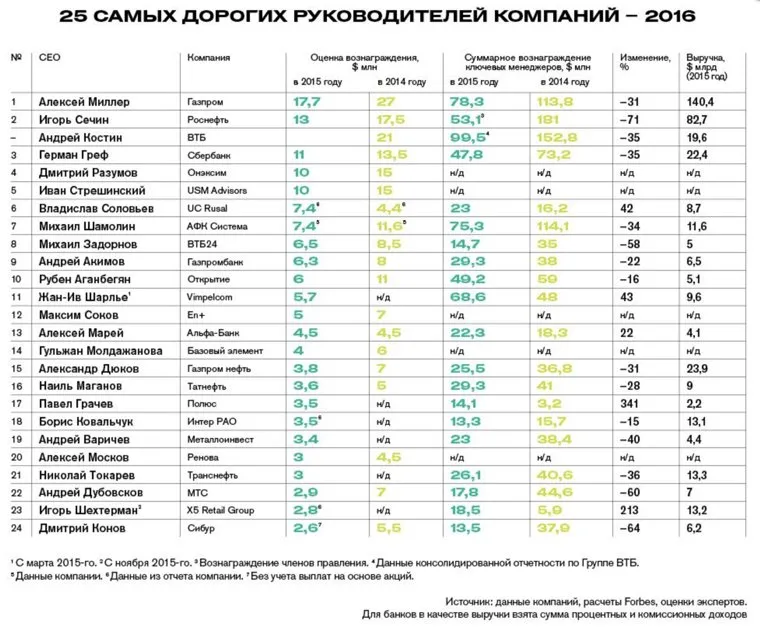 По итогам 2015 года самым высокооплачиваемым топ-менеджером стал председатель правления «Газпрома» Алексей Миллер, вознаграждение которого составило 17,7 млн долларов, На втором месте — руководитель «Роснефти» Игорь Сечин с заработком в 13 млн долларов. На третьем месте — глава Сбербанка Герман Греф с заработком в 11 млн долларов. Forbes составил рейтинг «25 самых дорогих руководителей».