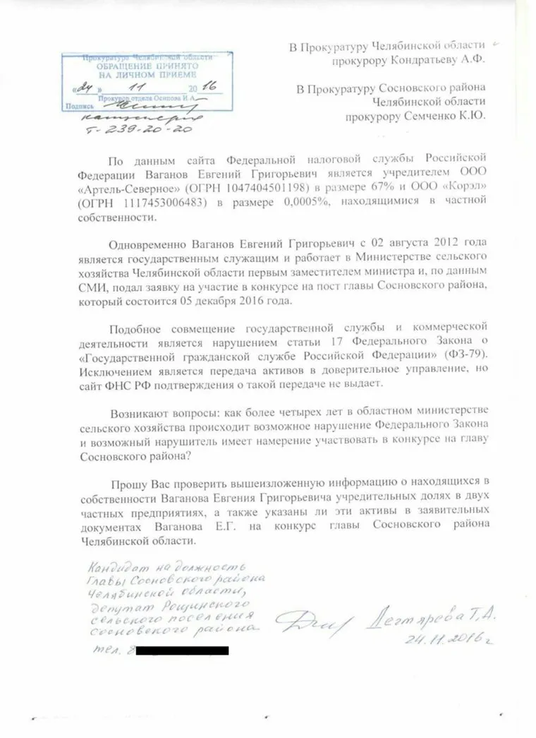 Прокуратура проверит информацию о бизнесе первого замминистра сельского хозяйства Челябинской области Евгения Ваганова. Как сообщила «URA.Ru» автор обращения в надзорное ведомство депутат Рощинского сельского поселения Татьяна Дегтярева, чиновник четыре года занимает должность, при этом являясь учредителем двух коммерческих фирм.