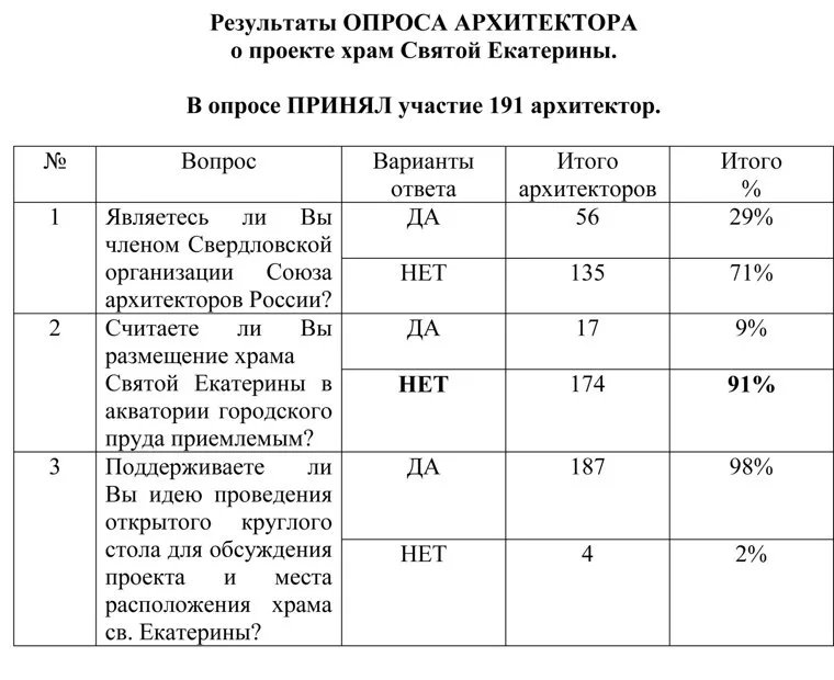 Особого внимания заслуживает позиция организаторов встречи, молодежной секции Свердловского отделения Союза архитекторов России. Опрос, проведенный организацией в преддверии мероприятия, показал однозначную неприязнь горожан к возведению храма в акватории пруда. В то же время сегодня секция поблагодарила всех участников мероприятия, не забыв поздравить с наступающим праздником — Днем Святой Екатерины.