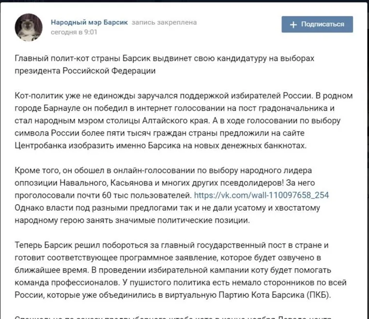 В обращении указано, что Барсик — «главный политический кот страны» и готовит программное предвыборное заявление, которое будет обнародовано чуть позже.
