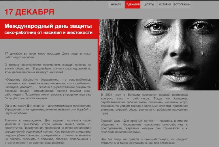 В интернете запущен сайт 17декабря.рф, посвященный теме жестокости и насилия в отношении проституток: в их защиту высказываются различные общественные деятели, например, региональный директор по странам Восточной Европы и Центральной Азии организации ЮНЭЙДС (программа ООН по ВИЧ/СПИДу), директор российского фонда помощи при СПИДе Денис Годлевский, руководитель волонтерской организации из Екатеринбурга «Новая жизнь» Вера Коваленко и другие.