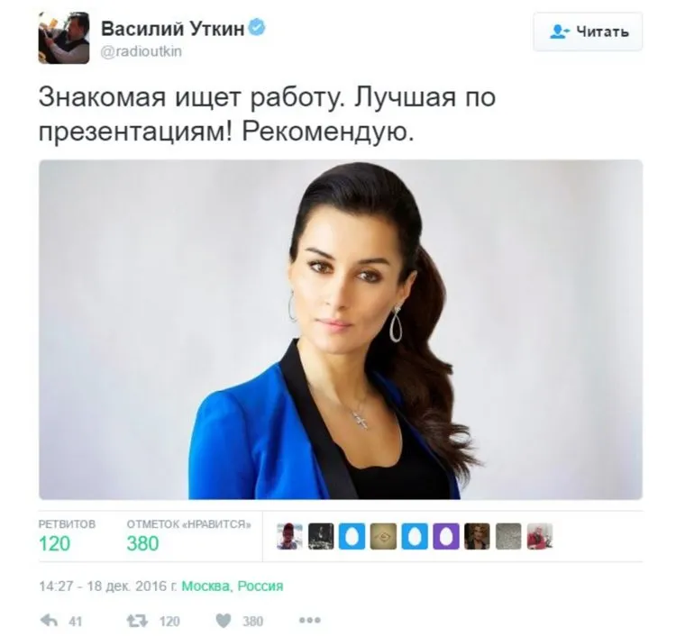 «Знакомая ищет работу. Лучшая по презентациям! Рекомендую», — написал Уткин в Twitter. При этом комментатор прикрепляет к записи фотографию Канделаки, пишет « Газета.Ru ».