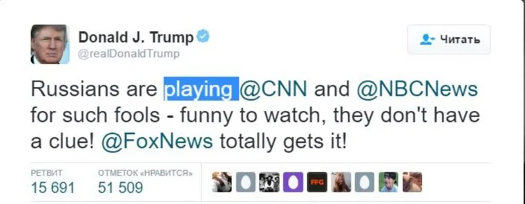 «Русские обыгрывают CNN и NBC News как дураков — смешно смотреть, у них [телеканалов] нет ни малейшего представления!» — написал Трамп в своем микроблоге в Twitter.
