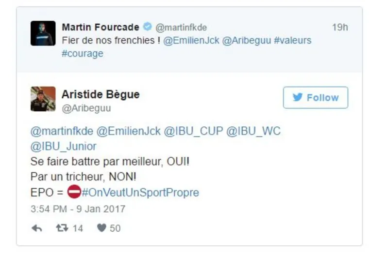 После проигрыша российскому биатлонисту Александру Логинову, выступающему за Тюмень, французский спортсмен Аристид Бегю заявил, что оскорблен победой «мошенника». Об этом он написал в своем микроблоге в Twitter.