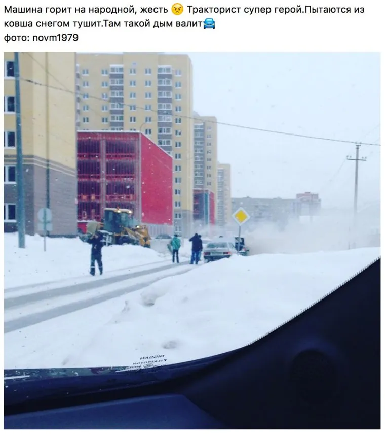 Фотографию горящей машины разместил в группе «ЧС Тюмень» во «ВКонтакте» один из пользователей с комментарием: «Машина горит на Народной, жесть. Тракторист — супергерой, пытается из ковша снегом тушить. Там такой дым валит…»