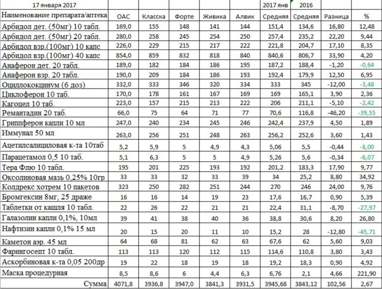Общее повышение стоимости 25 наименований лекарств за год составило +2,7%. Некоторые препараты подешевели. Наибольшее повышение цены зафиксировано на маску процедурную (+222%, большое количество производителей и поставщиков, различные модификации, дополнительные элементы), оксолиновую мазь (+35%), галазолин (+27%), колдрекс и терафлю (+9,8%, импортные препараты), каметон (+9%) и арбидол (+6,4%).
