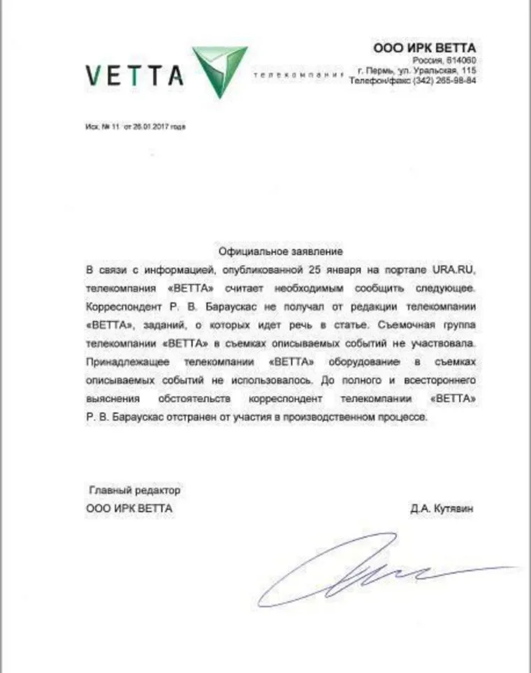 «В связи с информацией, опубликованной 25 января на портале „URA.RU“, телекомпания „ВЕТТА“ считает необходимым сообщить следующее, — говорится в документе. — Корреспондент Р.В.Бараускас не получал от редакции телекомпании „ВЕТТА“ заданий, о которых идет речь в статье. Съемочная группа телекомпании „ВЕТТА“ в съемках описываемых событий не участвовала. Принадлежащее телекомпании „ВЕТТА“ оборудование в съемках описываемых событий не использовалось. До полного и всестороннего выяснения обстоятельств корреспондент телекомпании „ВЕТТА“ Р.В.Бараускас отстранен от участия в производственном процессе».