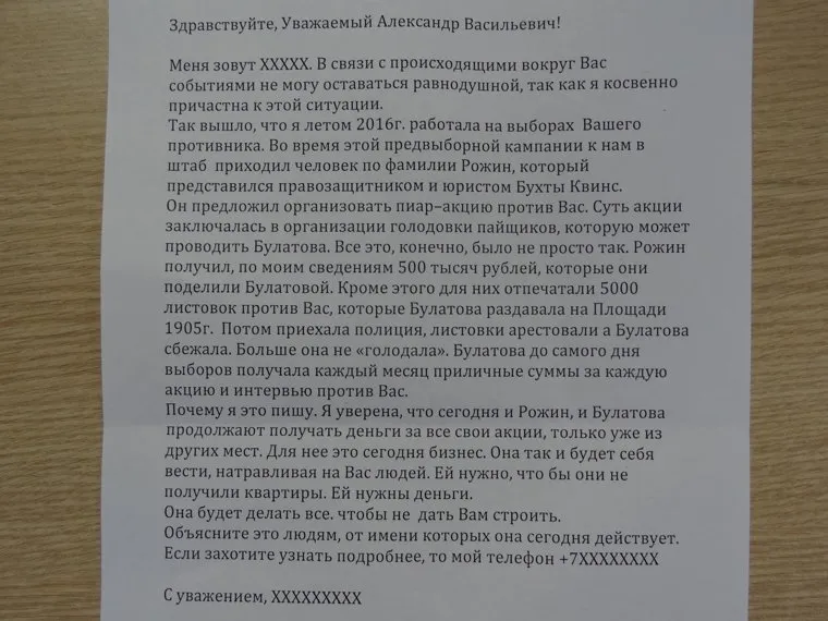Письмо, которое получил Александр Новиков от сотрудницы избирательного штаба его противника летом