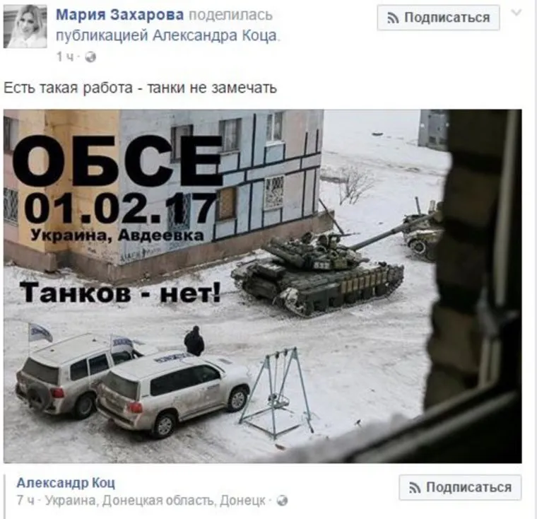 Официальный представитель МИД России Мария Захарова высмеяла членов мониторинговой миссии ОБСЕ, которые никак не отреагировали на введение украинских танков в Авдеевку. На своей странице в Facebook (деятельность запрещена в РФ) Захарова написала короткий, но едкий комментарий.