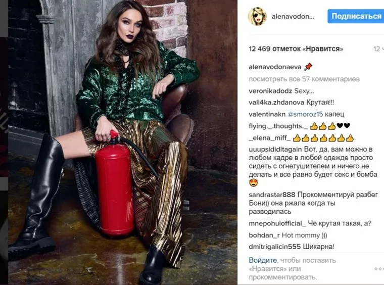 Тюменка Алена Водонаева поразила поклонников откровенным снимком. В своем аккаунте в Инстаграм (деятельность запрещена в РФ) девушка опубликовала фотографию с огнетушителем, которая собрала больше 12 тысяч «лайков». «Шикарная, роскошная женщина», — охарактеризовали ее подписчики.